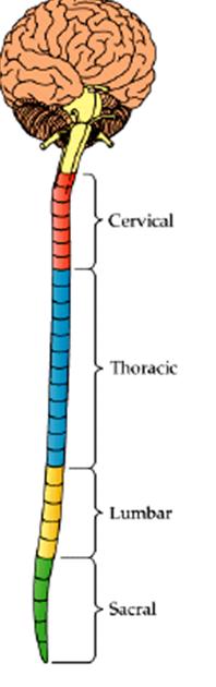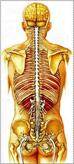 От спинного мозга отходят 31 пара смешанных спинномозговых нервов. Каждый нерв начинается двумя корешками, передним (двигательным), в котором находятся отростки двигательных нейронов и вегетативные волокна, и задним (чувствительным), по которому возбуждение передается к спинному мозгу.