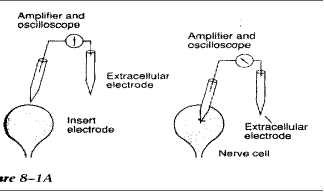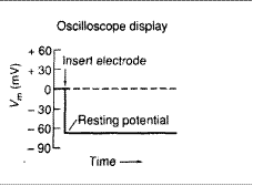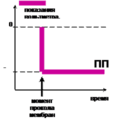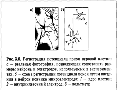 Для измерения ПП, а также другой электрической активности нервных клеток используют стеклянный микроэлектрод — трубочку с сильно вытянутым и утонченным кончиком, диаметр которого должен быть менее 1 мкм; в этом случае микроэлектрод, проткнув мембрану нейрона, не нанесет ему заметных повреждений. Полость трубочки заполняется раствором соли КС1 для обеспечения электрической проводимости. Пока кончик электрода находится в межклеточной среде, стрелка микровольтметра стоит на нуле (рис. 3.5). В момент прокалывания мембраны нейрона регистрируется скачок потенциала вниз до уровня ПП, и, если не смещать электрод относительно нервной клетки, потенциал сохраняется практически неизменным.