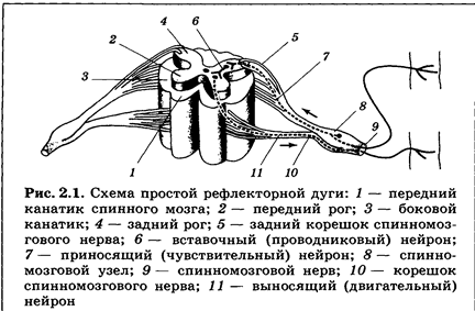 Простая рефлекторная дуга состоит из трех нейронов (рис. 2.1). Тело первого нейрона располагается в спинномозговом узле (или чувствительном узле черепного нерва). Периферические отростки этих чувствительных клеток (дендриты) проходят в составе соответствующих спинномозговых (или черепных) нервов на периферию, где заканчиваются чувствительными нервными окончаниями (рецепторами), воспринимающими раздражения. Возникший в рецепторе нервный импульс по нервному волокну передается к телу нервной клетки, а затем по ее аксону в составе чувствительного нерва поступает в спинной или головной мозг. В спинном или головном мозге нервный импульс передается следующему, второму (вставочному) нейрону, который проводит импульс к третьему выносящему (двигательному или секреторному) нейрону. Аксон (нейрит) третьего нейрона выходит из спинного (головного) мозга в составе переднего (двигательного) корешка спинномозгового или соответствующего черепного нерва и направляется к рабочему органу.