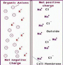 Концентрация ионов Na+ и Cl- выше во внеклеточном пространстве. Концентрация ионов K+ и органических анионов выше внутри клетки. В результате этого под действием электрохимических и электростатических сил возникает мембранный потенциал.