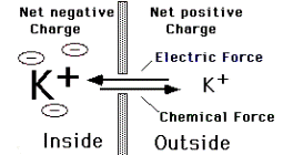 Электрохимическаясила (разница в концентрации иона внутри и внеклетки) приводит к выходу К+ из клетки, при этом из нее выносятся положительные заряды и возникает МП, накопление К+ на внешней поверхности мембраны препятствует дальнейшему выходу К+ из клетки – начинает действовать электростатическая сила в противоположном направлении. Потенциал, при котором наступает равновесие этих сил – калиевый равновесный потенциал.