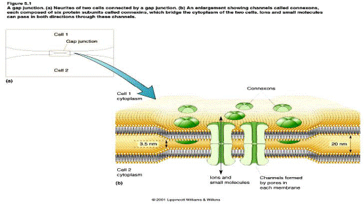 - низкоесопротивление мембран в месте контакта (каналы-коннексоны, через которые свободно проходят ионы).