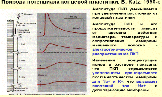 Классическими объектами для таких исследований стали нервно-мышечный синапс и симпатический ганглий. Структуры центральной нервной системы, где на теле или дендрите одного нейрона конвергируют много взаимодействующих синапсов, непригодны для таких оценок. Ритмическое раздражение двигательного нерва скелетной мышцы млекопитающего сопровождается быстрым снижением количества освобождаемого в ответ на каждый импульс медиатора, вплоть до некоторого относительно постоянного уровня. Это явление, называемое депрессией, показывает, что запас медиатора, способного к освобождению, ограничен и пополняется медленнее, чем расходуется. Депо АХ в нервно-мышечном синапсе оценивают примерной цифрой 2105 квантов. Быстрая депрессия потенциалов концевой пластинки отражает расходование небольшой части депо АХ — так называемой фракции доступного медиатора, которая составляет примерно 103 квантов для нервно-мышечного синапса лягушки.