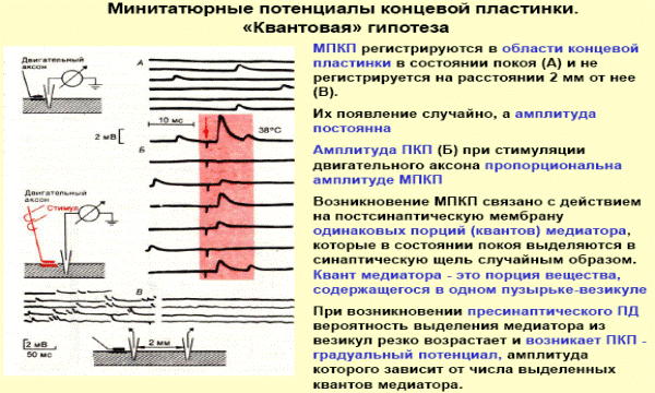 Следует отметить, что наряду с зависимой от ионов Са квантовой секрецией медиатора, которая обеспечивает передачу сигнала через синапс к постсинаптической клетке, а также происходит спонтанно, в отсутствие нервных импульсов, существует постоянная неквантовая утечка молекул медиатора из нервного окончания. В нервно-мышечном синапсе лягушки и млекопитающих неквантовая утечка создает концентрацию АХ в синаптической щели порядка 10~8-10~7М. Общее количество АХ, секретируемого неквантовым способом, превышает выход АХ, обусловленный спонтанной квантовой секрецией. Предполагается, что неквантовая секреция медиатора играет трофическую роль.