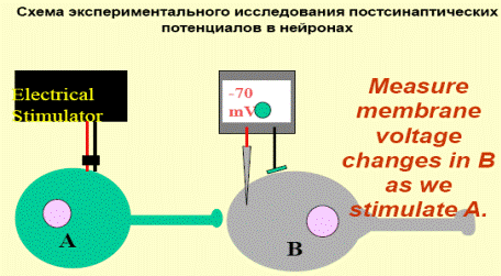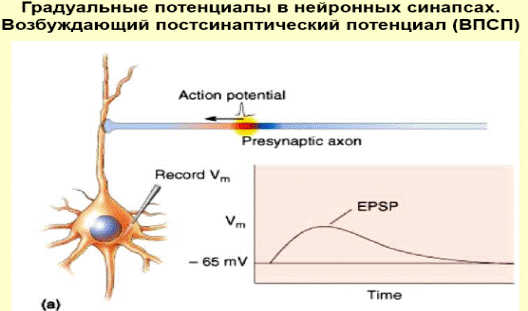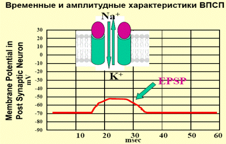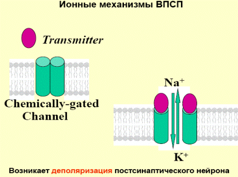 - в постсинаптической клетке происходит преобразование межклеточного химического сигнала во внутриклеточный электрический и возникает постсинаптический потенциал;