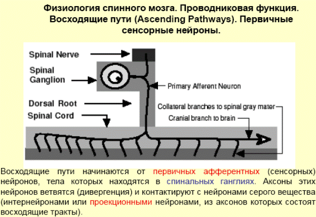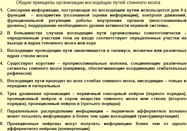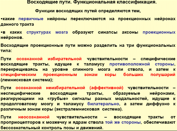 Система восходящих проводящих путей осуществляет функцию проведения импульсов от рецепторов, которые воспринимают информацию из внешнего мира и внутренней среды организма. В зависимости от вида чувствительности, которую они проводят, восходящие проводники делятся на пути экстеро-, проприо- и интероцептивной чувствительности.