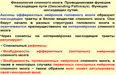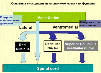 Система нисходящих проводящих путей осуществляет функцию проведения импульсов от различных отделов головного мозга к двигательным ядрам (клеткам) спинного мозга. В функциональном отношении нисходящие проводники могут быть охарактеризованы, в основном, как система волокон, осуществляющих двигательную функцию. Следует отметить, что в последние годы выявлена возможность проведения по данной системе афферентации к таким центрам продолговатого мозга, как дыхательный, вазомоторный и пищеварительные.