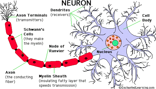 Клеточное тело - сома, содержит ядро и биохимический аппарат синтеза ферментов и разнообразных молекул, необходимых для жизнедеятельности клетки. Обычно тело имеет приблизительно сферическую или пирамидальную форму, размерами от 5 до 150 мкм в диаметре. Дендриты и аксон - отростки, отходящие от тела нейрона. Дендриты представляют собой тонкие трубчатые выросты, которые многократно ветвятся, образуя как бы крону дерева вокруг тела нейрона (dendron-дерево). По дендритам нервные импульсы поступают к телу нейрона. В отличие от многочисленных дендритов, аксон - единственный и отличается от дендритов как по строению, так и по свойствам своей наружной мембраны. Длина аксона может достигать одного метра, он практически не ветвится, образуя отростки лишь на конце волокна, его название происходит от слова ось (ass-ось). По аксону нервный импульс уходит из тела клетки и передается другим нервным клеткам либо исполнительным органам - мышцам и железам. Все аксоны заключены в оболочку из шванновских клеток (вид глиальных клеток). В некоторых случаях шванновские клетки просто окутывают аксон тонким слоем. Во многих же случаях шванновская клетка закручивается вокруг аксона, образуя несколько плотных слоев изоляции, называемой миелином. Миелиновая оболочка прерывается примерно каждый миллиметр по длине аксона узкими щелями - так называемыми перехватами Ранвье. В аксонах, имеющих оболочку такого типа, распространение нервного импульса, происходит путем его перескакивания от перехвата к перехвату, где внеклеточная жидкость оказывается в непосредственном контакте с клеточной мембраной. Такое проведение нервного импульса называется сальтотропным. Эволюционный смысл миелиновой оболочки, по-видимому, состоит в экономии метаболической энергии нейрона. Как правило, миелинизированные нервные волокна проводят нервные импульсы быстрее, чем немиелинизированные.