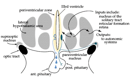 Супраоптическая область и паравентрикулярная зона содержат ядра, секретирующее гормоны в заднем гипофизе;