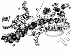 г - рибосома, на которой происходит синтез белка из аминокислот (образуется в ядре и выходит в цитоплазму),