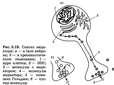 Образование медиатора часто происходит непосредственно в пресинаптическом окончании. Это возможно тогда, когда процесс синтеза является химически относительно простым (осуществляется в 1—2 стадии) и не требует каких-либо труднодоступных предшественников. Если эти условия не выполняются, образование медиатора идет в теле нейрона (рис. 3.18). Это наиболее характерно для пептидных медиаторов, возникающих в результате «вырезания» из более крупных белковых молекул.