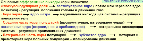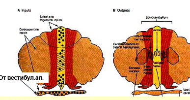 От спинного мозга (проприоцептивная информация) и ядер покрышки (зрительная информация) – к старой части (spinocerebellum)