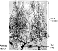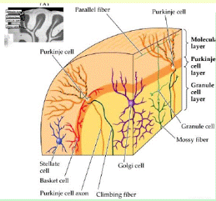 В коре мозжечка 6 типов клеток: Клетки Пуркинье (тела образуют слой клеток Пуркинье) – крупные нейроны с ветвящимися дендритами, составляющими молекулярный слой, их аксоны – выходы коры мозжечка.