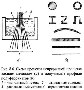 Жидкофазные способы используют на всех стадиях производства КМ - от полуфабрикатов до изделий. К ним относятся протяжка волокон, жгутов и тканей через расплав материала матрицы для пластифицирования волокна и получения соответствующих препрегов; пропитка пакетов препрегов материалом матрицы на стадии получения полуфабрикатов или готовых изделий из КМ; плазменные и некоторые другие виды газотермического распыления металлов для получения ленточных препрегов и "корковых" полуфабрикатов, подвергаемых последующему компактированию методами обработки давлением.