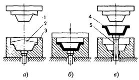 Прямое (компрессионное) прессование. В полость матрицы пресс-формы 3 (рис. 8.13, а) загружают предварительно таблетизированный или порошкообразный материал 2. При замыкании пресс-формы под действием силы пресса пуансон 1 создает давление на прессуемый материал (рис. 8.13, б). Под действием этого давления и теплоты от нагретой пресс-формы материал размягчается и заполняет формообразующую полость пресс-формы. После определенной выдержки, необходимой для отверждения материала, пресс-форма раскрывается и с помощью выталкивателя 5 из нее извлекается готовая деталь 4 (рис. 8.13, в).