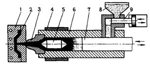 Перерабатываемый материал из загрузочного бункера 8 (рис. 8.15) подается дозатором 9 в рабочий цилиндр 6 с электронагревателем 4. При движении поршня 7 определенная доза материала поступает в зону обогрева, а уже расплавленный материал через сопло 3 и литниковый канал - в полость пресс-формы 1, в которой формируется изготовляемая деталь 2. В рабочем (нагревательном) цилиндре на пути потока расплава установлен рассекатель 5, который заставляет расплав протекать тонким слоем у стенок цилиндра. Это ускоряет прогрев и обеспечивает более равномерную температуру расплава. При движении поршня в исходное положение с помощью дозатора 9 очередная порция материала подается в рабочий цилиндр. Для предотвращения перегрева выше 50... 70 °С в процессе литья пресс-форма охлаждается проточной водой. После охлаждения материала пресс-форма размыкается и готовая деталь с помощью выталкивателей извлекается из нее.