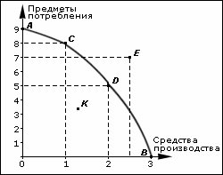 реальный вариант предполагает, что имеются различные комбинации производства средств производства и потребительских товаров. Точка Е показывает, что экономика не располагает ресурсами, достаточными, чтобы производить 7 ед. предметов потребления и 2,5 ед. средств производства, а т. К показывает, что ресурсы экономики используются не полностью.