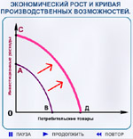 Факторы, влияющие на смещение кривой производственных возможностей. экономический рост определяется смещением кривой производственных возможностей вправо. Рост количества и качества ресурсов и совершенствование технологии обеспечивает возможность такого сдвига, а для его реализации существенны полная занятость и оптимальное распределение ресурсов. Каждая точка на кривой представляет некий максимальный объем производства указанных двух видов продуктов (товаров). Комбинацию этих товаров можно варьировать: больше инвестиционных товаров означает меньше потребительских и наоборот. Выбор экономикой позиций на кривой для данного момента способствует определению кривой в будущем. Выбор в пользу потребительских(экон.наст.) товаров приведет лишь к умеренному смещению вправо в будущем, а в пользу инвестиционных(экон.буд.) - будет иметь своим следствием гораздо большее смещение кривой вправо.