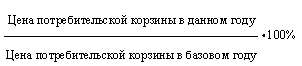 Индекс потребительских цен определяется по формуле: (Стоимость потребительской корзины за данный год разделить на стоимость потребительской корзины за прошлый год)умножить на 100% Индекс потребительских цен (Consumer Price Index, CPI) - основной показатель инфляции он измеряет изменение цен товаров и услуг, входящих в фиксированную потребительскую корзину, охватывающую товары и услуги постоянного спроса (продукты питания, одежда, топливо, транспорт, медицинское обслуживание и т.д.).