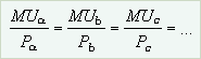 Потребитель максимизирует полезность путем выбора такого потребительского набора, удовлетворяющего бюджетному ограничению, при котором отношение предельной полезности к цене одинаково для всех благ. В результате такого выбора достигается потребительское равновесие - при котором потребитель максимизирует полезность, получаемую им от покупки разных товаров при имеющемся бюджете. И которое означает, что любое увеличение полезности от потребления одного блага будет требовать сокращение полезности от потребления другого блага.