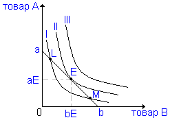 Кривая безразличия II и бюджет минимальны, с ab пересекаются в точке Е, что приносит потребителю максимальную полезность. Точки L и M на кривой безразличия I потребитель отвергает, т.к. его доход может претендовать на более высокую полезность. Кривая безразличия III для потребителя недоступна, т.к. полезность ее очень высока, а доход потребителя ограничен.