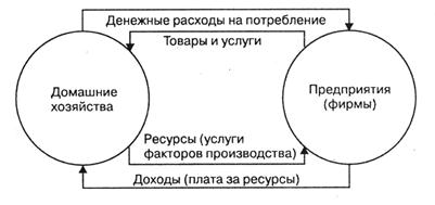 Домохозяйства рассматриваются как собственники всех ресурсов: труда, капитала, земли и предпринимательских способностей. За ресурсы, поставляемые на рынок ресурсов, домохозяйство получает денежный доход (заработную плату за труд, арендную плату за землю, процент за капитал, прибыль за предпринимательские способности). Денежный доход расходуется на приобретение товаров и услуг на рынке продуктов. Следовательно, домохозяйства формируют спрос на продукты и услуги и предложение на рынке ресурсов.