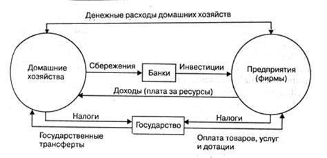 - выступает в роли производителя общественных благ, а также других товаров и услуг. Схема кругооборота с участием государства и учетом инвестиционной деятельности демонстрирует процесс, в котором осуществляется расширение масштабов производства. В этом случае домашние хозяйства не тратят на потребление весь доход, а откладывают часть его в форме сбережений. Как отмечалось выше, сбережения — это та часть дохода, которая не используется на потребление. Перераспределение сбережений и превращение их в инвестиции происходит при участии банков, выполняющих роль посредников.