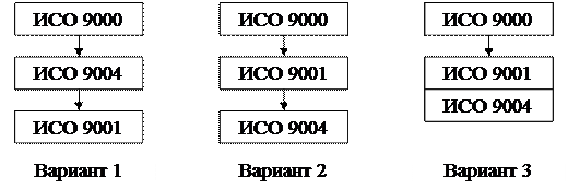 При формировании в организации СМК в соответствие с требованиями ИСО 9000 специалисты ООО «Конфлакс» предлагают следующие варианты стратегии внедрения (рисунок 4). В связи со сложностью внедрения стандарта ИСО 9004, положения которого носят