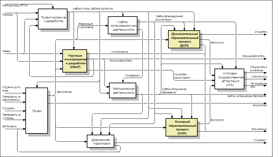 Следующим важным шагом проектирования процессной модели системы менеджмента качества является разработка проекта сети процессов и видов деятельности (например, рисунок 6), которая также может осуществляться с помощью IDEF0 и IDEF3 (например, рисунок 7). Далее этот проект рассматривается на заседании Совета по качеству. В случае обнаружения несоответствий проводятся корректирующие действия. Сеть процессов организации утверждается на заседании Совета по качеству.