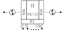 На рисунке 8 приведено условно-графическое обозначение (УГО) мультиплексора уровня STM-16 c вводом / выводом 126 трактов 2Мбит/с и функцией кросскоммутации уровня VC-12, работающий по оптическому волокну, для правильного соединения мультиплексоров линейные стороны обозначают Е - (east – восток) и W – (west – запад). Соединения выполняют E→W→E→W, то есть условно передача идет с востока на запад.