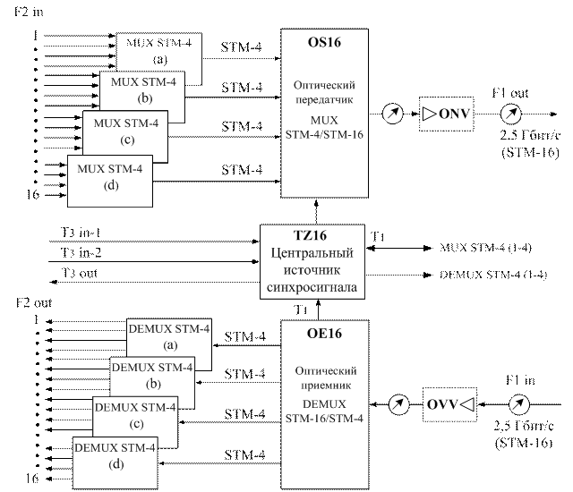Демультиплексирование сигнала STM-16 происходит в два этапа. Сначала (в плате приемника STM-16) формируются четыре сигнала STM-4, затем они преобразуются (в плате демультиплексора STM-4) в 16 сигналов STM-1.