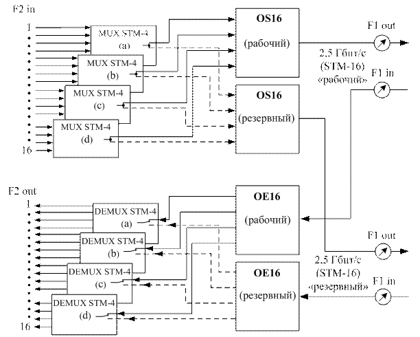 Когда требуется организовать мультиплексорную секцию с резервированием (1+1), используют два приемника и два передатчика, рабочий и резервный, рисунок 11. Оптические усилители и блок TZ16 не показаны.