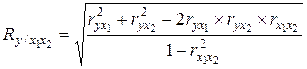 Множественный коэффициент корреляции в случае зависимости результативного признака от двух факторов вычисляется по формуле: