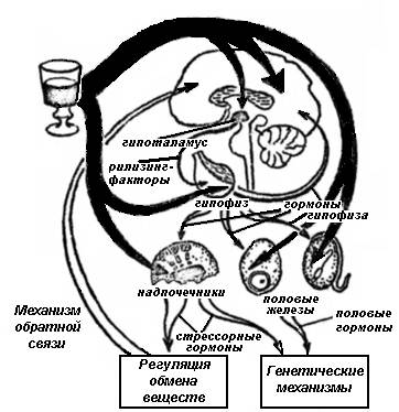 Рис. 1. Схема основных направлений воздействия алкоголя на эндокринную систему человека