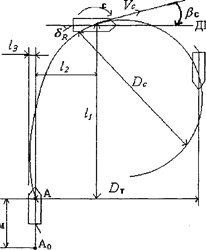 l3 - обратное смещение - расстояние между линией первоначального курса и параллельной ей касательной к траектории движения в начальные периоды поворота, т.е. смещение ц.т. судна в сторону, обратную направлению поворота.