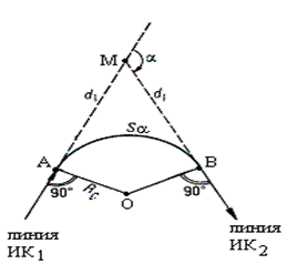 2. Расстояние d1 откладывается от точки М пересечения начального и нового курсов по линиям ИК1 и ИК2 (см. рис 1). В результате будут получены точка начала поворота А и точка окончания поворота В.