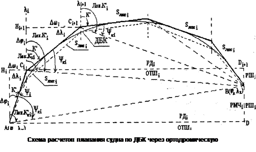 Направление ДБК в каждой ее промежуточной точке определяется касательной к ней и вычисляется через ортодромическую поправку между направлениями ДБК и локсодромии на конечную точку: