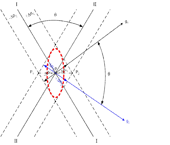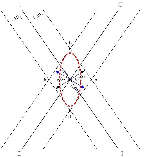 Предположим, что место судна по двум линиям положения I—I и II—II было получено в точке Р (рис.1), но из-за случайных ошибок наблюдений каждая линия положения может сместиться на величину ± Δn. Тогда, отложив ±An1 и ±An2 от точки Р по нормалям к линиям положения, строят параллелограмм.