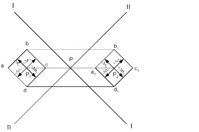 Если обсервованное место Р было определено по двум линиям положения I—I и II—II одного типа (рис. 3), то, определив по величинам систематических ошибок возможное смещение судна (точки Р1 и Р2), строят параллелограммы abcd и а1b1с1d1 с учетом случайных ошибок. Затем соединяют вершины b и b1, d и d2 параллелограммов и получают общую площадь возможного места судна аbb1с1d1d.