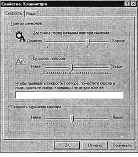 6. В окне папки «Клавиатура» (двойной щелчок мыши по значку Клавиатура панели управления) на вкладке Скорость установите скорость повтора и мерцания курсора, а также интервал перед началом повтора и символа (рис. 3.3).