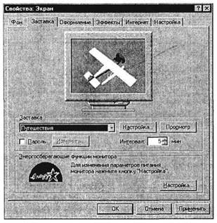 10. Заставка экрана (хранитель экрана) выбирается в списке заставок. Время простоя компьютера, после которого появляется экранная заставка, устанавливается в минутах в списке Интервал. Установите понравившуюся вам заставку и задайте интервал 5 мин.
