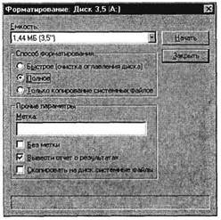 4. Задайте параметры форматирования дискеты как на рис. 5.4 и нажмите на кнопку Начать. После окончания форматирования на экран будет выведен отчет о результатах форматирования. Если на дискете будут обнаружены дефектные участки, т.е. общая емкость диска не совпадает с емкостью доступной памяти, то дискетой лучше не пользоваться.