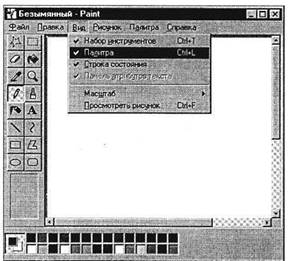 3. Изучите внешний вид окна Paint. Начните с обзора общих для всех программ Windows элементов: заголовка, кнопок системного меню, кнопок управления окном – Свернуть, Восстановить, Закрыть.