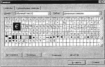 Вставьте после текста следующие символы (меню Вставка, команда Символ) (рис. 9.4).