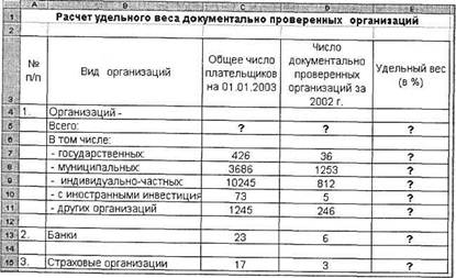 4. На листе «Удельный вес» создайте таблицу «Расчет удельного веса документально проверенных организаций» по образцу, как на рис. 17.1.