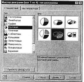 На первом шаге работы с мастером диаграмм выберите тип диаграммы – Круговая {Объемный вариант разрезанной круговой диаграммы) (рис. 17.2).