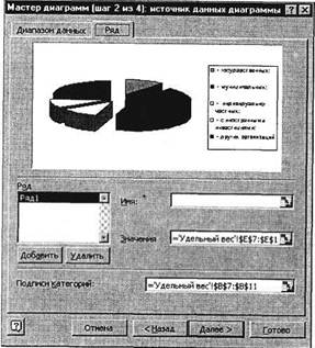 На втором шаге на вкладке Ряд в окошке Подписи категорий укажите интервал ячеек В7:В11 (рис. 17.3).