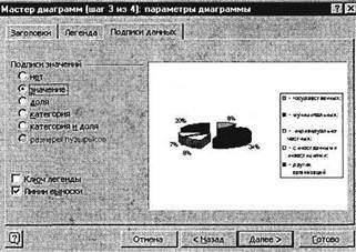Третий шаг мастера диаграмм. Введите название диаграммы на вкладке Заголовки; укажите подписи значений на вкладке Подписи данных (рис. 17.4).