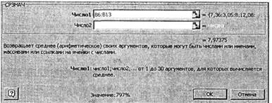 После нажатия на кнопку ОК откроется окно для выбора диапазона данных для вычисления заданной функции. В качестве первого числа выделите группу ячеек с данными для расчета среднего значения В6:В13 и нажмите кнопку ОК (рис. 18.3). В ячейке В14 появится среднее значение данных колонки «В».
