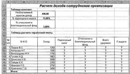 Всего удержано = Подоходный налог - Отчисления в благотворительный фонд, в ячейку F10 введите формулу = D10 + E10; К выдаче = Оклад - Всего удержано, в ячейку G10 введите формулу = C10-F10.